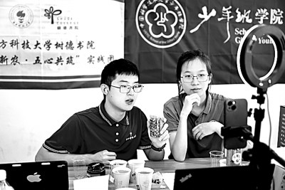 安徽省亳州市利辛县江集镇郑大楼村,南方科技大学社会实践团队的大学生通过网络直播推销农产品。刘勤利摄/光明图片